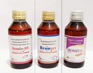Composition : BRONSET - Ambroxol 15mg.+Terbutaline 1.25mg+ Guaiphenesin 50mg + Menthol 1mg (SUGAR FREE) ; BRONSET-DX -Dextromethorphan Hydro bromide IP 10mg +Chlorpheniramine Maleate IP 2 mg. + Phenylephrine Hydrochloride IP 5 mg SUGAR FREE ; BRONSET-LS - Levosalbutamol 1 Mg+ Ambroxol Hydrochloride 30mg+ Guaiphenesin 50mg / 5ml (SUGAR FREE)